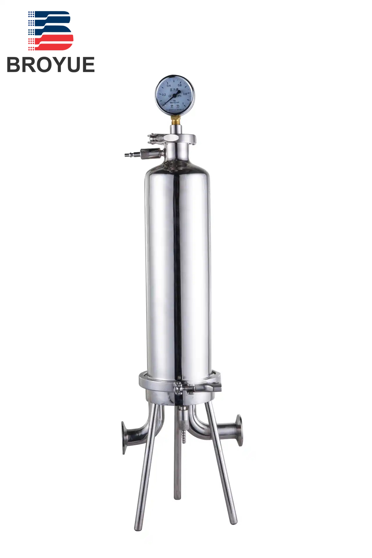 Hygienic Design & ComplianceBroyue sanitary filters are engineered to meet the strictest hygienic standards, featuring:  - Dead-space-free construction for complete drainage and zero product retention  - Fully compliant with GMP requirements for high-cleanliness applications  - 304/316L stainless steel construction with tri-clamp (TC) inlet/outlet connections  - Fully disassemblable design: Removable housing and cartridge plate enable 360° cleanability  - Ultra-smooth surface finish: Mirror polish (Ra <0.4μm) on all housing internal surfaces  - Multi-brand compatibility: Supports Pall, Millipore, and 3M filter cartridges