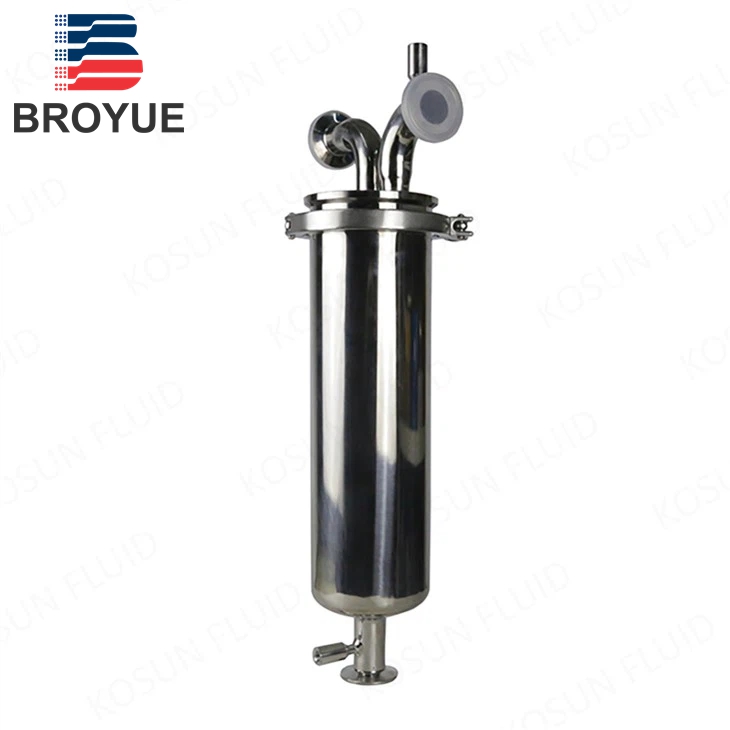 Hygienic Design & ComplianceBroyue sanitary filters are engineered to meet the strictest hygienic standards, featuring:  - Dead-space-free construction for complete drainage and zero product retention  - Fully compliant with GMP requirements for high-cleanliness applications  - 304/316L stainless steel construction with tri-clamp (TC) inlet/outlet connections  - Fully disassemblable design: Removable housing and cartridge plate enable 360° cleanability  - Ultra-smooth surface finish: Mirror polish (Ra <0.4μm) on all housing internal surfaces  - Multi-brand compatibility: Supports Pall, Millipore, and 3M filter cartridges